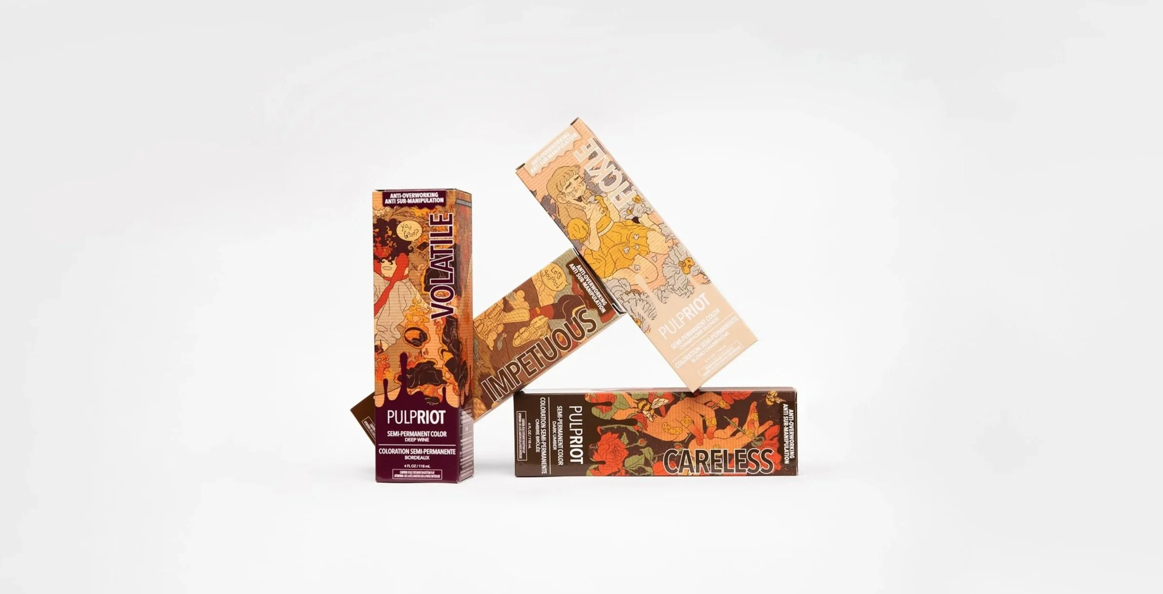 Four new natural-toned semi-permanent shades for the impulsive Pulp Riot client who wants to take a walk on the natural side without the commitment of permanent color. For this project we collaborated with artist Jasmyn Arnold (@bottlingsunshine). Jasmyn created evocative illustrations that captured the emotions reflected in the color shades - Impetuous, Fickle, Careless, and Volatile. Normal ≠ Boring.